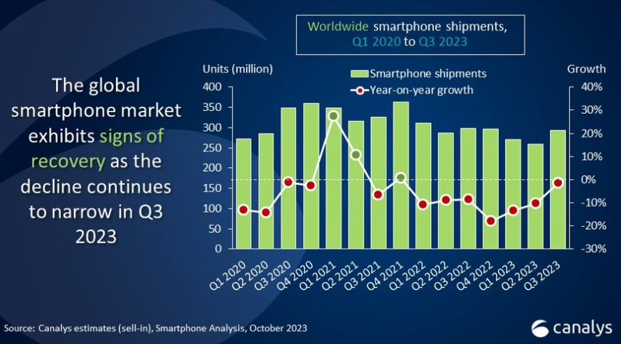 18일 시장조사업체 카날리스에 따르면 올해 3분기 글로벌 스마트폰 출하량은 전년 동기 대비 1% 하락했다. 하락세는 면치 못했지만, 이전 분기 대비 하락폭은 크게 감소했다.