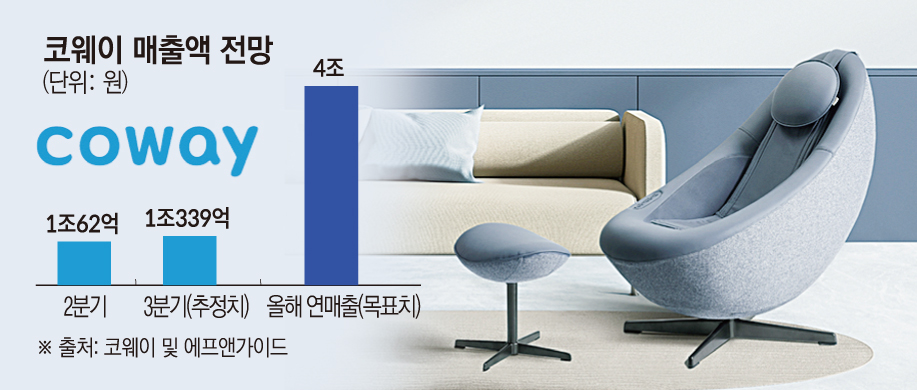 23일 금융정보업체 에프앤가이드에 따르면 코웨이의 올해 3분기 매출액은 1조339억 원으로 전망된다. 전년 동기(9698억 원) 대비 6.6% 증가한 수치다. 영업이익은 1891억 원으로 전년(1651억 원)보다 14.5% 확대될 것으로 추정된다.