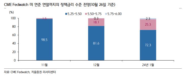 27일 안예하 키움증권 연구원은 “11월 FOMC에서 미국 연방준비제도(Fed)는 정책금리를 5.25~5.50%로 동결할 것”이라며 “9월 FOMC 이후 국채발행 증가 등에 따라 국채금리가 급등세를 보이면서 실질금리가 상승했고, 이로 인해 긴축적인 금융 여건이 조성된 데 따른 영향”이라고 했다.