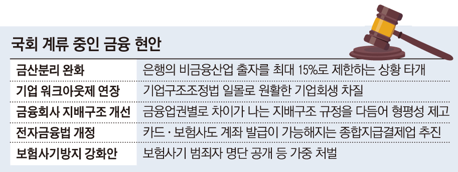 ‘기업구조조정촉진법(기촉법)’ 연장도 국회 문턱을 넘지 못하고 있다. 기촉법은 2001년 한시법으로 최초 제정된 기업개선작업(워크아웃) 절차를 담은 기본법이다. 그동안 5차례 일몰 연장을 거쳐 22년간 유지됐지만, 이번 회기에는 법원과 금융위 간 의견 차를 좁히지 못했다. 카드업계는 종합지급결제업 진출이 수개월째 제자리걸음을 걷고 있다.