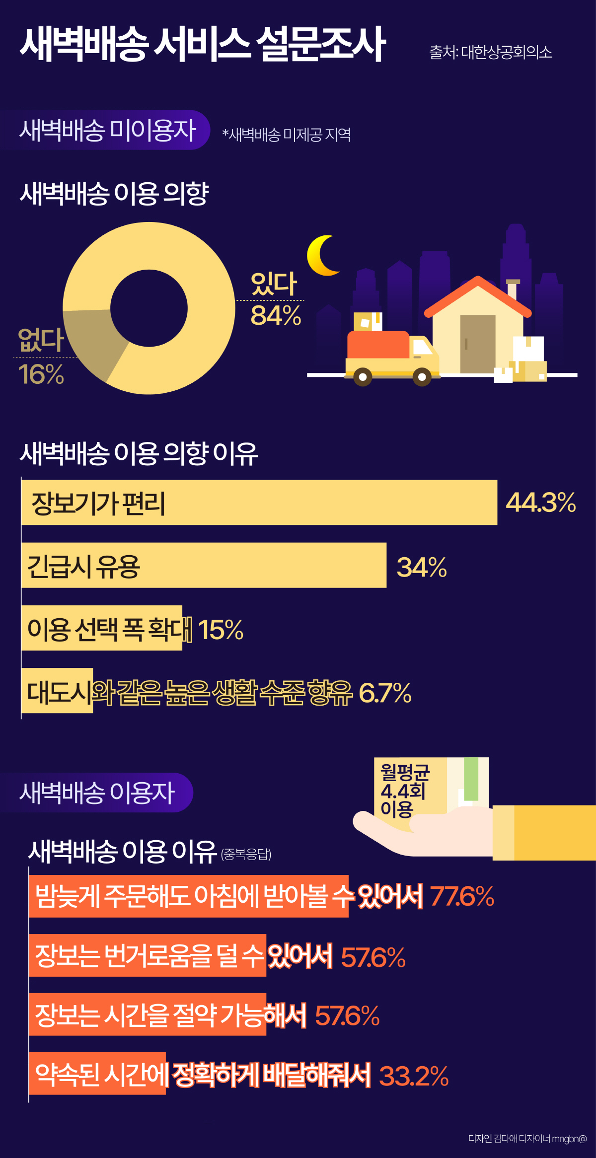 대한상공회의소가 소비자 1000명을 대상으로 ‘새벽배송에 대한 이용현황과 이용의향’를 조사한 결과, 새벽배송 서비스 미제공 지역 소비자의 84%가 ‘새벽배송 서비스가 제공되면 이용할 의향이 있다’라고 답했다.