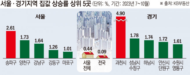 12일 KB부동산 ‘월간 아파트값 변동률’ 분석 결과, 하반기(7~10월) 기준 누적 변동률 상위 5곳(서울·수도권은 구 단위, 기타 시 단위)은 경기 과천시(4.90%)와 서울 송파구(2.61%), 경기 성남시 수정구(1.78%), 하남시(1.74%), 서울 양천구(1.73%) 순으로 집계됐다.