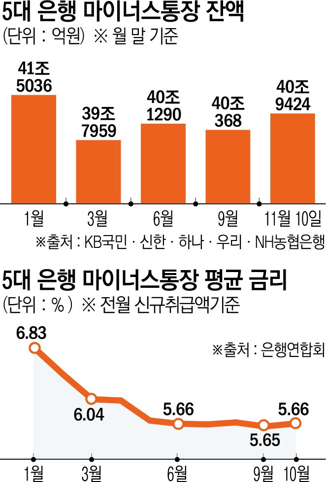 15일 은행권에 따르면 5대 은행(KB국민·신한·하나·우리·NH농협)의 마통 잔액은 10일 기준 40조9424억 원으로 열흘 만에 55억 원 증가했다. 10월 말 기준 잔액은 40조9369억 원으로 전월(40조368억 원)보다 9001억 원 늘었다.