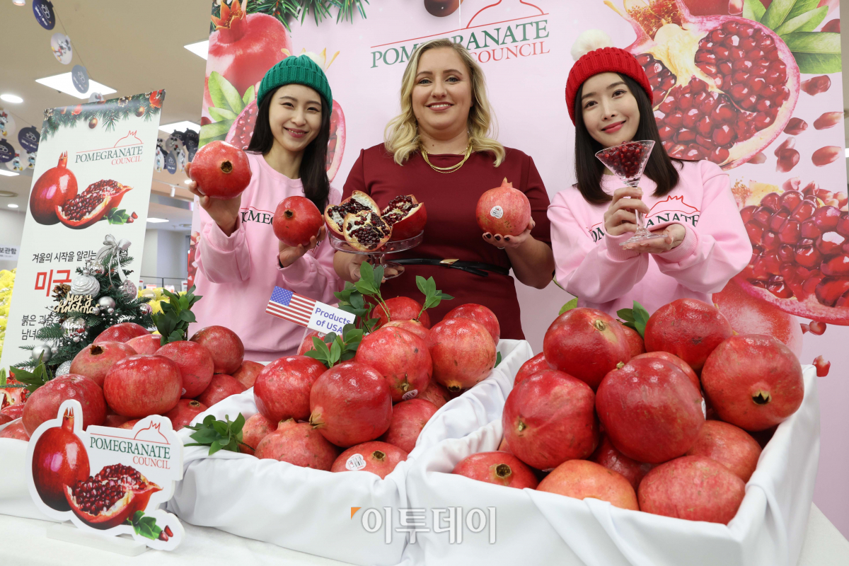 17일 서울 중구 롯데마트 서울역점에서 리사 앨런 미대사관 농업무역관장 등이 미국 석류를 홍보하고 있다. 국내 마트, 백화점 등에서 동시 판매되는 미국 석류는 캘리포니아에서 주로 생산된다. 타 지역 석류에 비해 과육이 크고 단단하며 과피가 팽팽한 것이 특징이다.