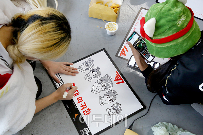 2023리그오브레전드 월드 챔피언쉽 결승전이 열린 19일 서울 구로구 고척스카이돔에서 한 팬이 한국선수단의 응원 메시지를 작성하고 있다. 사진공동취재단