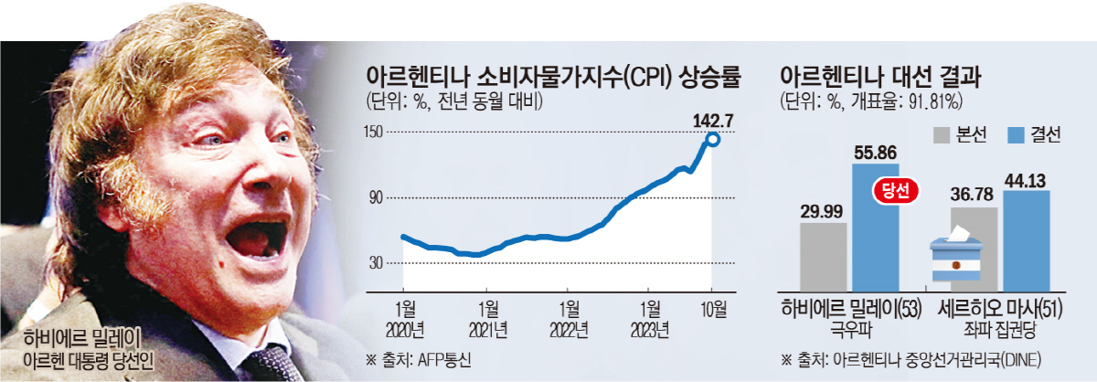 국가 부도도 수차례 겪었다. 국제통화기금(IMF)은 최근 5년간 아르헨티나에 430억 달러(약 55조 원)를 대출했는데, 이는 어느 국가보다도 많다. 그런데도 상황이 계속 악화하자 정부를 향한 국민적 분노는 극에 달했다. 현직 경제장관인 마사가 패배한 것도 이런 요인에서 비롯됐다. 워싱턴포스트(WP)는 “궁극적으로 분노가 두려움을 이겼다”고 분석했다.