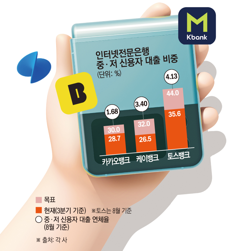 다만, 중·저 신용자 대출 목표치를 무리하게 채울 경우 연체율 상승과 건전성 악화로 이어질 수 있다. 8월 말 기준 인터넷은행 3사의 평균 신용 대출 연체율은 1.20%. 시중은행 평균 0.43%의 3배 수준에 달한다. 중·저신용자 대출 연체율은 더 심각하다. 카카오뱅크 1.68%, 케이뱅크 3.40%, 토스뱅크 4.13%로 평균 연체율이 3.07%까지 치솟은 상태다.