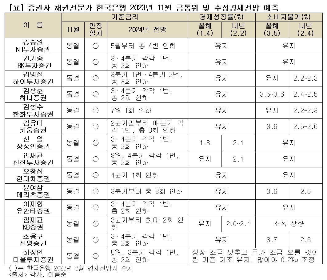 전문가들은 한국은행이 11월 금융통화위원회에서 기준금리를 동결할 것으로 예상했다. 이견이 없는 만장일치일 것으로 봤다. 수정경제전망의 경우 성장률은 기존 전망치를 유지할 것으로 본 전문가가 많았던 반면, 소비자물가는 상향조정과 기존전망을 유지할 것으로 본 전문가가 비슷했다.