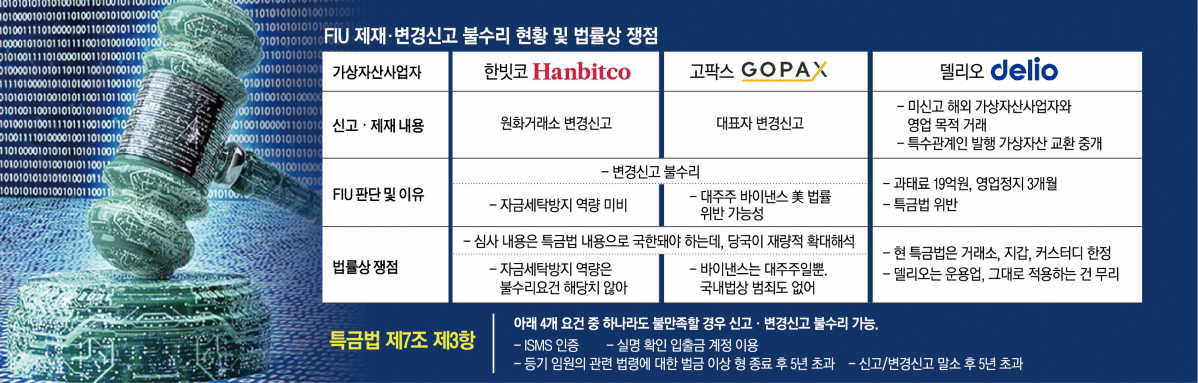 문제는 현행 특금법에 이런 요건이 명시되지 않았다는 점이다. 특금법 제7조 제3항은 가상자산사업자 신고 수리의 요건으로 △정보보호 관리체계(ISMS) 인증 획득 △실명 확인 입출금 계정 이용 △사업자에 대한 벌금 이상 형 종료 후 5년 초과 △신고·변경신고 말소 후 5년 초과 등을 나열적으로 명시하고 있다. 법조계에서는 앞선 4개의 조건을 만족하는 경우, 거짓으로 조건을 만족한 것이 아닌 이상 원칙적으로 FIU가 변경 신고를 수리해야 한다는 의견이다.