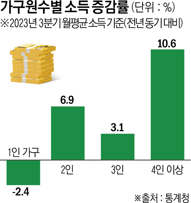 26일 통계청 가계동향조사에 따르면 3분기 1인 가구의 월평균 소득은 278만3000원으로 전년 동기 대비 2.4% 줄었다. 반면 2인 가구는 6.9%, 3인 3.1%, 4인 이상 가구 10.6% 늘었고 전체 평균도 3.4% 증가했다.