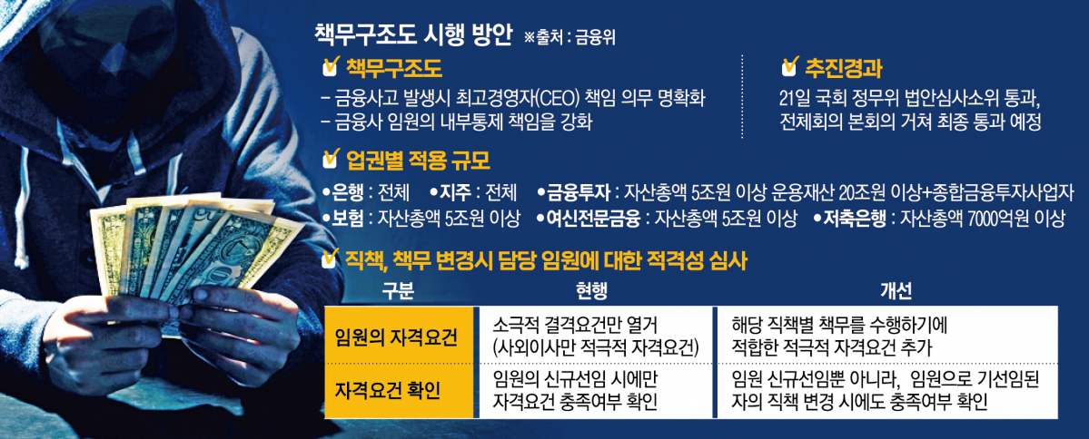 책무구조도가 최종 국회 문턱을 넘으면 금융회사 임직원의 횡령·배임 등의 사고에 대한 CEO의 책임이 강화된다. 금융지주 회장과 은행장을 비롯해 임원별로 담당하는 내부통제 업무가 법적 근거에 따라 명확하게 규정되는 것이다.