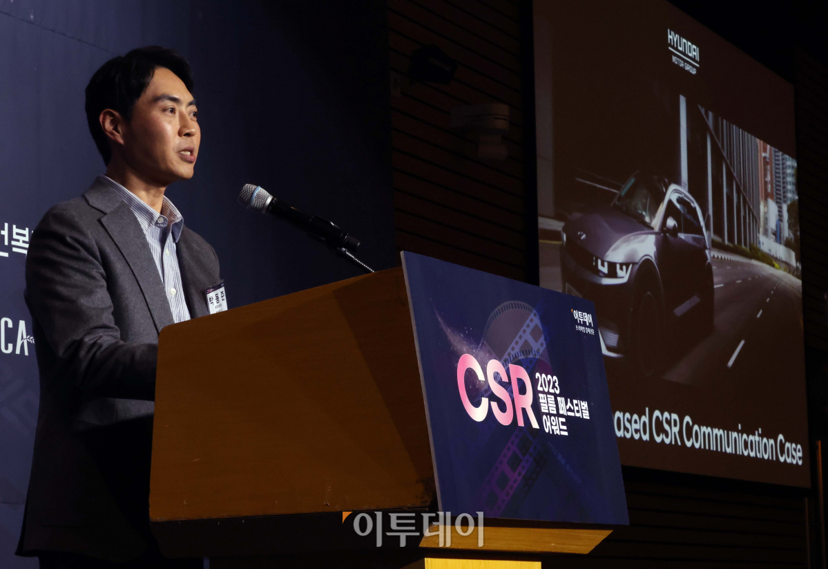 박동준 현대자동차 책임매니저가 30일 서울 여의도 FKI타워 컨퍼런스센터에서 열린 ‘2023 CSR 필름 페스티벌 어워드’에서 기획재정부장관상 수상에 앞서 CSR 사례를 발표하고 있다. 경제신문 이투데이가 주최한 이 행사는 한 해 동안 사회적 가치 창출을 위한 CSR 활동 발자취를 공모하고 그 업적을 격려하기 위해 마련된 자리로 2012년 첫걸음을 내디뎌 올해로 12회째를 맞이했다.
