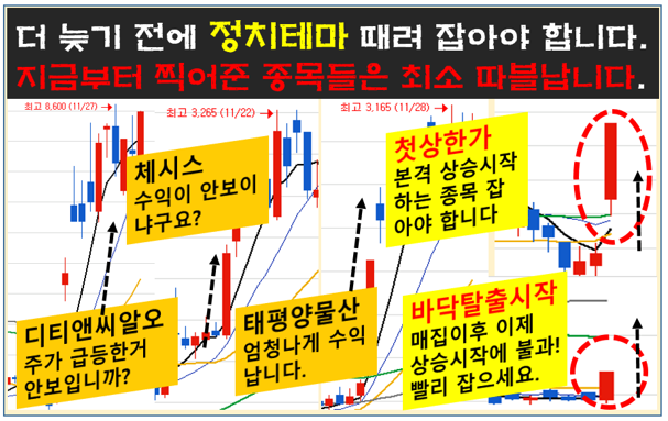 정치테마로 초급등 시세를 먹고, 단기매매로 생활비까지 번다면 금상첨화가 될 것입니다.