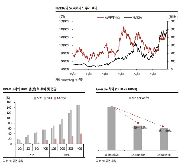 SK증권은 6일 반도체 업종에 대해 비중확대 의견을 제시하며 "HBM 관점에서 AI 센티먼트 악화는 부정적일 수 있지만, AI칩의 HBM 요구 용량 증가와 GPU 업계 외 시장 참여, HBM 공급자들의 거래선 다변화 등을 감안하면 메모리업계의 AI를 통한 펀더멘털의 강화 포인트는 변하지 않았다"고 평가했다.