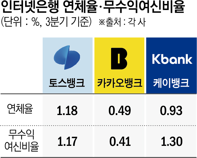 3분기 토스뱅크 연체율은 1.18%다. 인터넷전문은행 3사 중 가장 높고 시중은행 평균 0.43%보다도 세 배 높은 수준이다. 카카오뱅크와 케이뱅크 연체율 역시 0.49%, 0.93%를 기록했다.