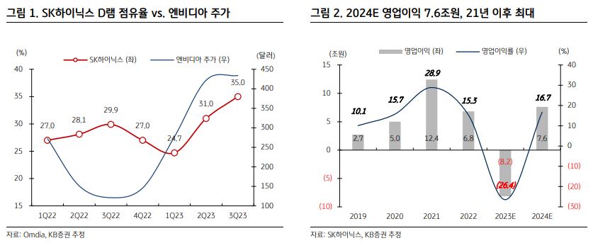 김 연구원은 “엔비디아 주가는 19일 기준 500.77달러를 기록해 52주 신고가에 근접했다”며 “엔비디아에 HBM3를 독점 공급 중인 SK하이닉스는 HBM3E에서도 경쟁사의 공급 물량이 10~20% 수준에 그칠 것으로 추정돼 독과점적 공급 지위는 지속될 전망”이라고 했다.