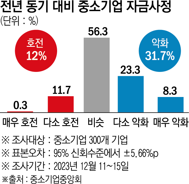 올해 자금 사정에 대해 ‘악화했다’는 응답이 31.7%를 차지했다. 지난해와 ‘비슷하다’는 응답은 56.3%로 집계됐고, ‘호전됐다’는 응답은 12.0%에 그쳤다.