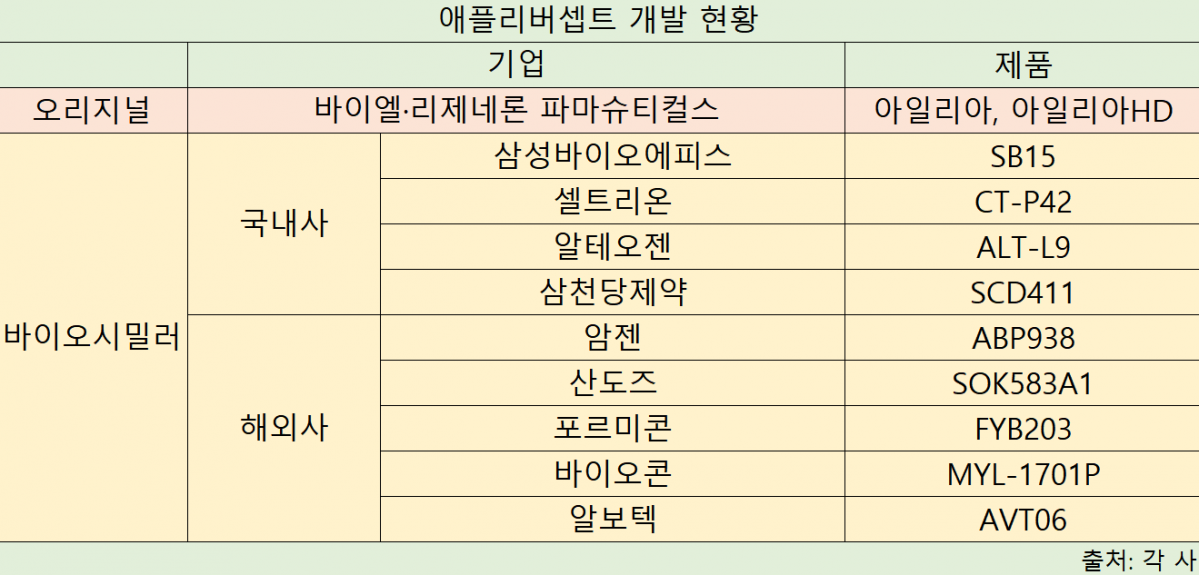 아일리아 바이오시밀러 출시를 준비하는 국내외 기업 간 경쟁도 치열할 것으로 보인다. 아일리아의 미국 독점권은 2024년 5월, 유럽 물질특허는 2025년 11월에 만료될 예정이다. 국내에서는 알테오젠과 삼천당제약, 해외에서는 암젠, 산도즈, 포르미콘, 바이오콘, 알보텍 등이 아일리아 바이오시밀러를 개발 중이다.