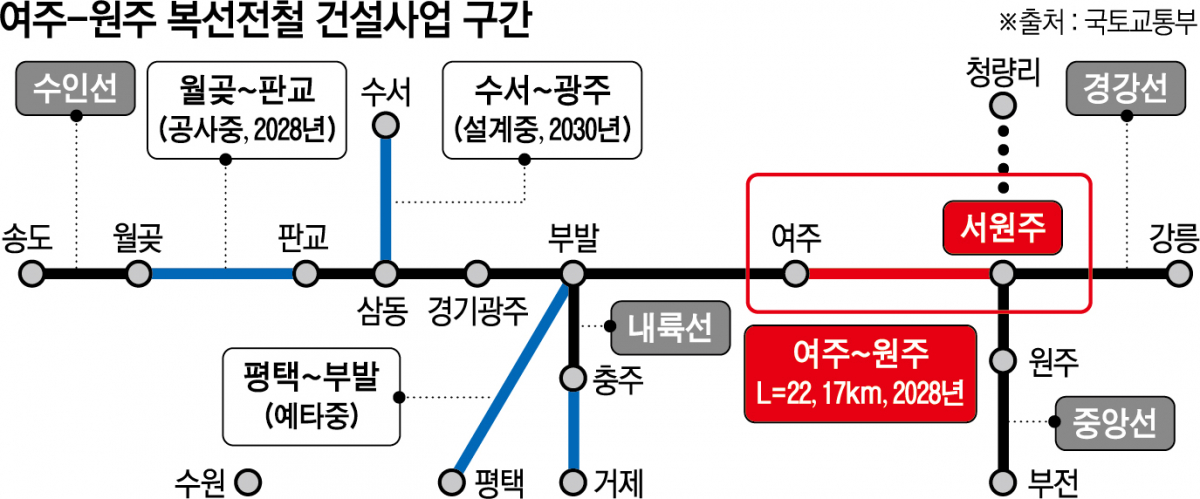 여주~원주 복선전철 건설사업은 여주역에서 서원주역까지 22.2㎞의 경강선 구간을 연결하는 사업으로 총 사업비 약 9309억 원을 투입해 2028년 개통을 목표로 추진된다.