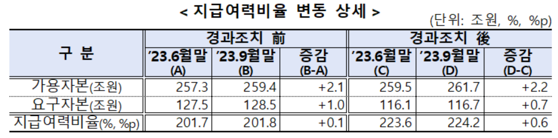 16일 금융감독원에 따르면 2023년 9월말 경과조치 적용 후 보험회사의 지급여력비율은 224.2%로 전분기(223.6%) 대비 0.6%p 높아진 것으로 집계됐다.