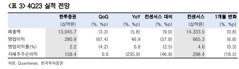 그는 “에너지솔루션 지분가치를 70% 넘게 할인받는 만큼 밸류에이션에 미치는 영향은 줄어든다”며 “양극재 부진이 1분기까지 이어지는 점도 예상했었지만, 영업이익은 4분기가 바닥”이라고 했다.