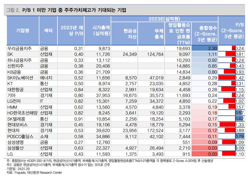 이어 “PBR이 1배 미만이고 시가총액이 8조 원 이상인 기업 중 현금성 자산, 부채총계, 영업활동현금흐름을 기준으로 선별한 기업은 하나금융지주, 현대차, LG 등 19개”라고 덧붙였다.