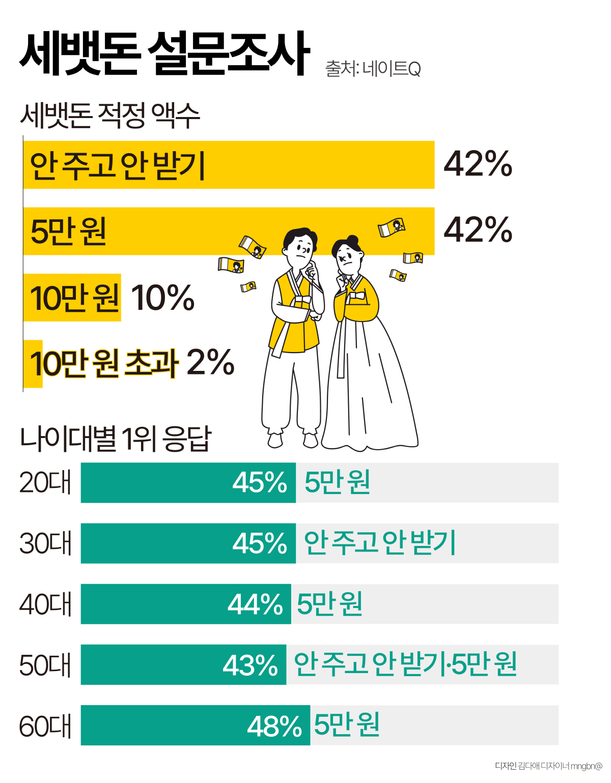 설문 응답을 연령대별로 보면 20대·40대·60대는 ‘5만 원’을 가장 많이 선택했다. 30대는‘안 주고 안 받기’를 50대는 ‘안 주고 안 받기’·‘5만 원’을 가장 많이 선호했다.