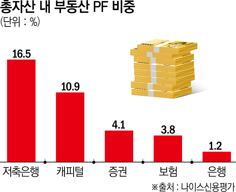 신용평가기관 나이스 신용평가에 따르면 지난해 9월 말 기준 총자산 내 부동산 PF 비중은 저축은행 16.5%, 캐피털 10.9%로, 증권(4.1%), 보험(3.8%), 은행(1.2%)보다 압도적으로 높았다. 부동산 PF 중 브리지론 비중도 저축은행 55%, 캐피털 35%에 달했다.