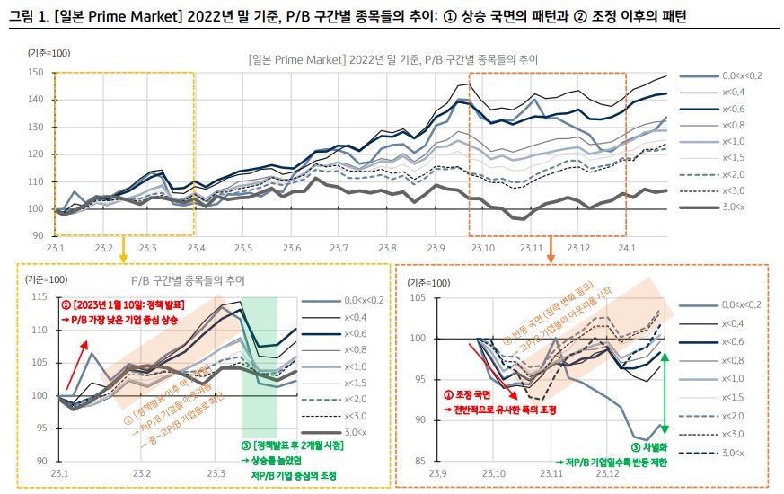 하 연구원은 “일본 증시의 경우, 정책 발표 직후 약 2개월간(2023년 1~2월) 상승한 후 지난해 3월에는 조정이 나타났다”며 “일본의 지난해 3월 조정에서 얻을 수 있는 시사점은 ‘초저PBR 기업들’의 낙폭이 가장 컸다는 점”이라고 했다.