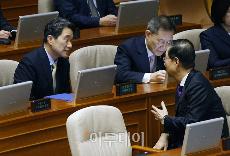 한덕수(오른쪽) 국무총리와 이주호 사회부총리 겸 교육부 장관이 20일 서울 여의도 국회 본회의에서 더불어민주당 교섭단체 대표연설 시작 전 대화하고 있다. 고이란 기자 photoeran@