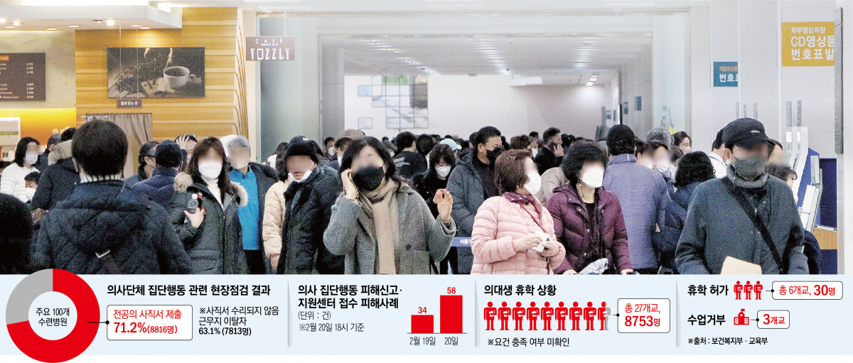 전공의 95%가 몰린 주요 100개 수련병원 소속 전공의 중 8816명이 사직서를 제출한 것으로 확인됐다. 사직서가 수리된 사례는 없으나, 7813명이 근무지를 이탈했다.
