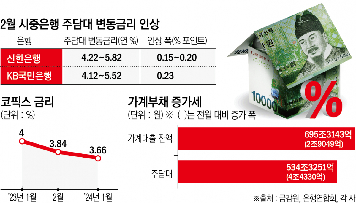 앞서 KB국민은행은 7일 주담대 가산금리를 0.23%p 올렸다. 이로써 신규 코픽스 기준 변동형 주담대 금리는 5일 연 4.07~5.47%에서 이날 기준 연 4.12~5.52%, 혼합형 주담대 금리 역시 연 3.39~4.79%에서 연 3.75~5.15%로 인상했다.