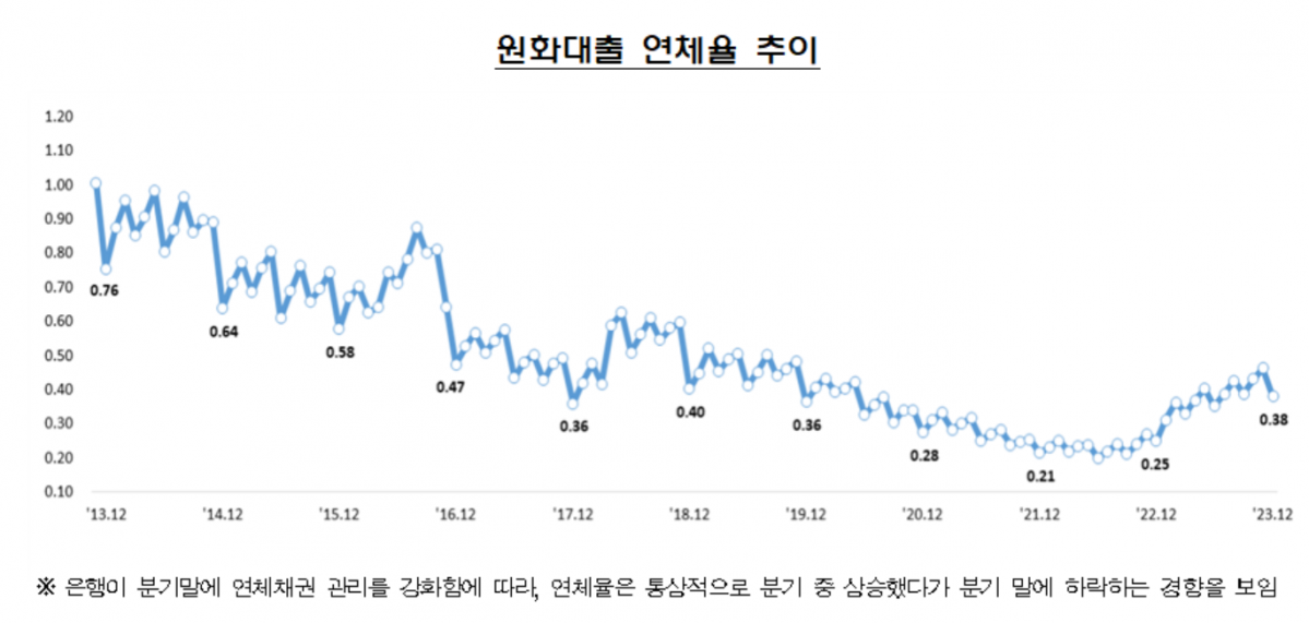 금융당국은 지난해 12월말 연체율은 신규발생 연체채권이 감소하고 연체채권 정리규모(상·매각 등)가 확대되면서 전월말 대비 큰 폭으로 하락했다고 했다. 다만, 신규연체율이 전년 대비 높은 수준을 유지하고 있어 향후 연체율 상승세가 당분간 지속될 가능성에 대비할 필요가 있다고 판단했다.