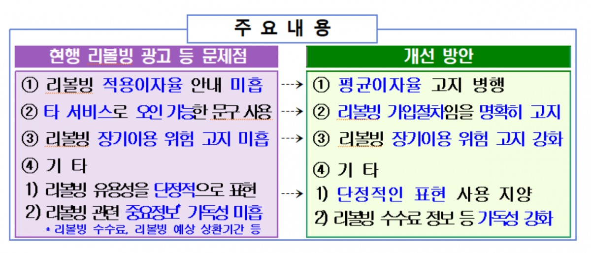 앞으로 홈페이지 및 앱 광고 등에 리볼빙 적용이자율을 고시할 때는 최소·최대 범위뿐만 아니라, 평균 이자율도 병행하여 기재해야 한다.