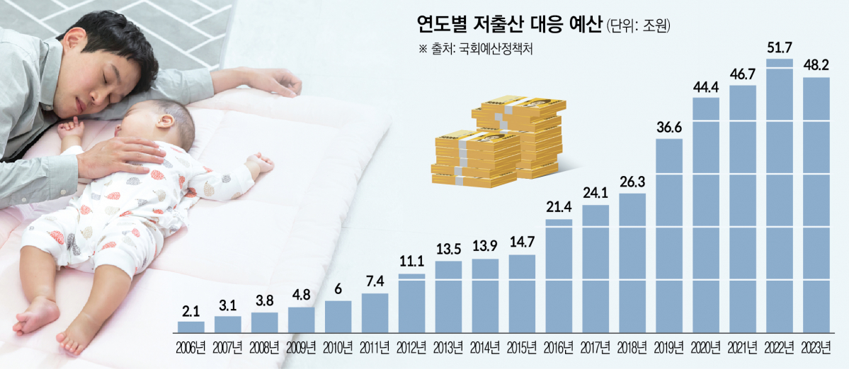 저출산 해소를 위해 장기간 천문학적인 액수의 혈세가 투입됐음에도 오히려 출생아 수는 지속적으로 줄고 있다. 2006년 45만1759명이던 출생아 수는 2017년 30만 명대(35만7771명)로 떨어졌다. 2020년에는 30만 명선(27만2337명)이 붕괴됐고, 2023년에는 23만 명으로 연간 기준 역대 최저를 찍었다.