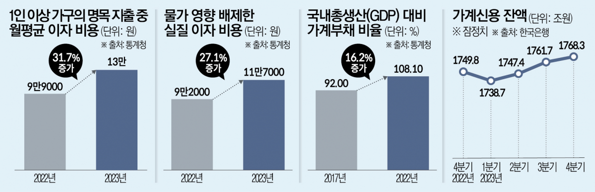 이처럼 이자 비용이 대폭 늘어난 것은 코로나19 시기 늘어난 가계부채와 고금리 장기화 상황이 맞물린 결과다.
