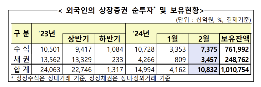 외국인은 유가증권시장에서 7조2760억 원을 순매수했고, 코스닥 시장에서 1000억 원 순매수했으며, 2월 말 기준 전체 시총의 28.1% 수준인 762조 원을 보유 중이다.