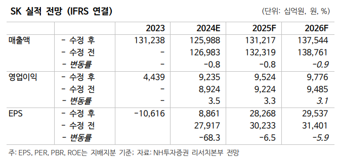 NH투자증권이 SK에 대해 올해 실적이 개선될 것으로 전망했다. 투자의견은 ‘매수’, 목표주가는 29만 원을 유지했다. 전 거래일 기준 종가는 18만2700원이다.