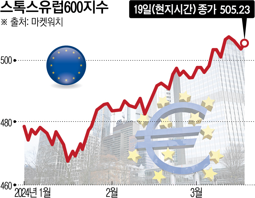 반면 유럽증시는 역사적 고점을 넘나들고 있다. 범유럽지수인 스톡스유럽600지수는 7일(현지시간) 종가 기준으로 사상 처음으로 500선대로 올라섰으며 지난주까지 8주 연속 상승하며 2018년 이후 가장 긴 강세 흐름을 나타냈다. 또 독일 프랑크푸르트증시 DAX30지수와 프랑스 파리증시 CAC40지수는 각각 14일 장중에 1만8039.05과 8148.14로 역대 최고치를 찍었다.