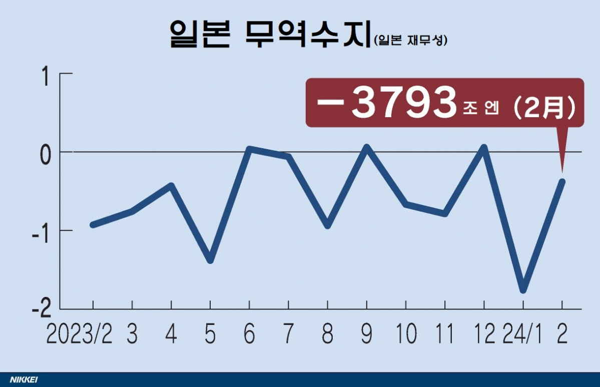 21일 니혼게이자이(닛케이)신문은 일본 재무성 발표를 인용해 "2월 무역통계(속보치)에 따르면 지난달 무역수지 적자액은 3794억 엔(약 3조3500억 원)으로 집계됐다"고 보도했다.