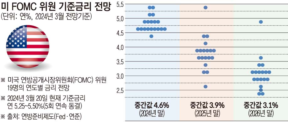 또 올해 연말 금리 예상치(중앙값)를 4.6%로 유지해 연내 세 차례의 금리 인하가 있을 것을 시사했다. 이는 더딘 인플레이션 둔화 추세에 따라 연준이 올해 예상 금리 인하 횟수를 연 2회로 줄일 수 있다는 시장의 우려를 일축한 것이다.