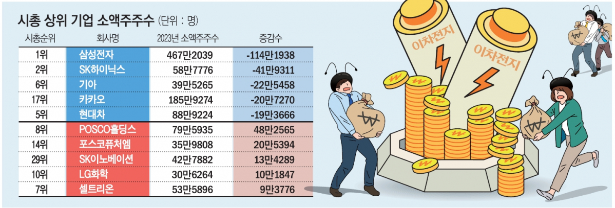 시총 1위 삼성전자의 지난해 소액주주수는 467만2039명으로 전년 대비 114만1938명(19.6%) 줄며 가장 큰 감소폭을 보였다. 2022년 삼성전자 소액주주수는 500만 명대였다. 시총 2위 SK하이닉스는 58만7776명으로 전년보다 41만9311명(-41.6%) 줄었다. 100만 명대에서 50만 명대로 반토막났다. 지난해 삼성전자와 SK하이닉스의 주가는 각각 42%, 87% 상승했다. 하락했던 주가가 복귀하자 소액주주들이 주식을 판 것으로 보인다. 특히, 삼성전자는 주가가 6만~7만 원대에서 장기간 머물며 답보 흐름을 보인 탓에 소액주주수 감소가 컸던 것으로 보인다.