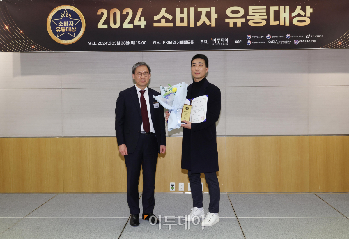 28일 서울 여의도 FKI타워 컨퍼런스센터에서 열린 ‘2024 이투데이 소비자 유통대상’에서 최우수상인 상생협력부문상을 수상한 박순영 KGC인삼공사 마케팅실장이 시상자인 김덕헌 이투데이 대표이사와 기념촬영을 하고 있다. 이투데이 소비자 유통대상은 해마다 진화하는 한국 유통산업을 선도하고 소비자의 편익 증진을 위해 노력한 기업 및 혁신 브랜드를 발굴 및 시상하고 소통하는 자리다.
