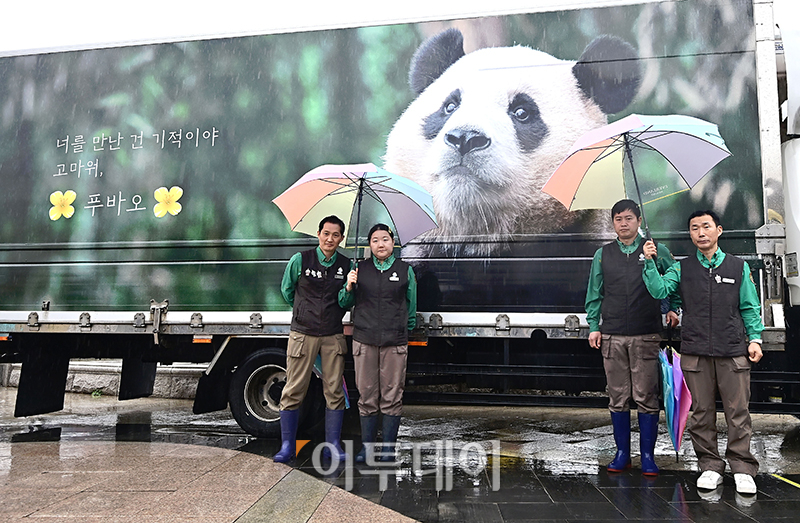 강철원, 송영관, 오승희 사육사가 3일 용인 에버랜드 장미원에서 푸바오를 실은 특수차량과 기념촬영을 하고 있다. 사진공동취재단