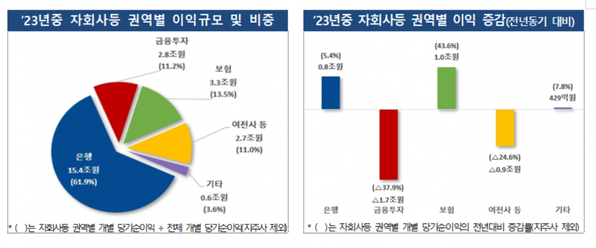 자회사 권역별 이익 비중으로는 은행이 15조4000억 원으로 61.9%를 차지했다. 이어 여전사 등 2조7000억 원(11%), 금융투자 2조8000억 원(11.2%), 보험 3조3000억 원(13.5%) 순으로 나타났다.