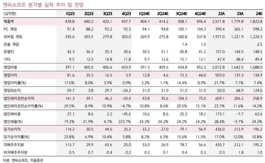 김 연구원은 “엔씨소프트의 올해와 내년 영업이익 추정치를 기존 대비 25.6% 감소 조정했다”며 “이는 다중접속역할수행게임(MMORPG) 시장의 레드오션화와 해당 세그먼트에 대한 경쟁사의 공격적 신작 출시 등을 감안해 기존 모바일 게임 매출을 하향 조정했다”고 했다.