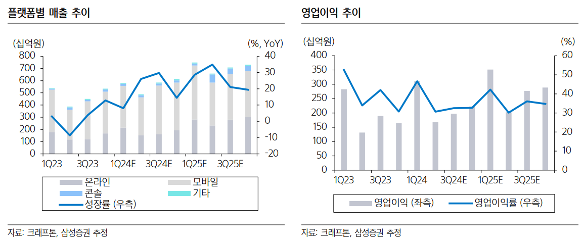 그는 “다중접속 역할수행게임(MMORPG) 중심 국내 대형사들이 실적 악화로 어려움을 겪는 가운데 크래프톤은 기존 IP의 라이프사이클 확대로 성장이 지속되고 있다”며 “퍼블리싱 라인업 확대와 인도 지역 진출로 추가 성장성을 확보하고 있는 만큼 밸류에이션 프리미엄이 확대될 것”이라고 했다.