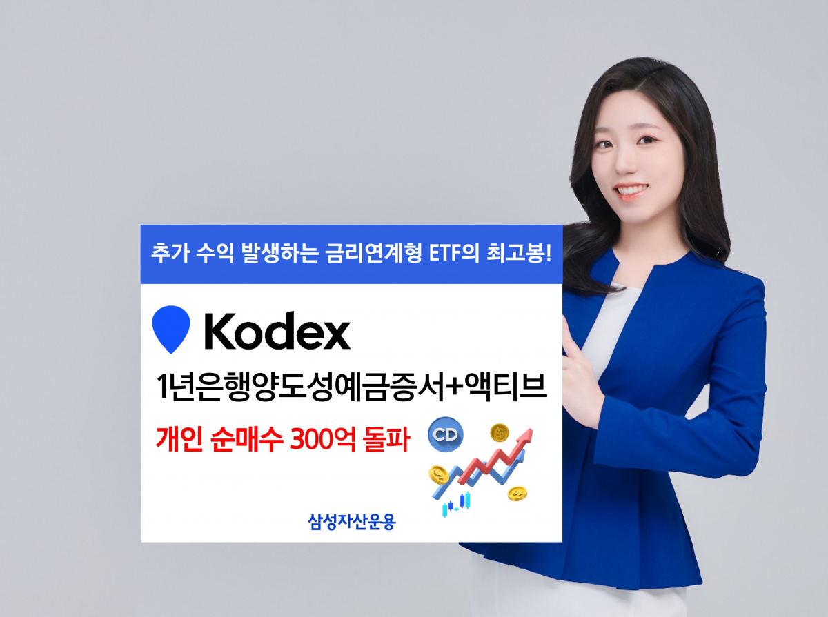삼성자산운용은 ‘KODEX 1년은행양도성예금증서+액티브 상장지수펀드(ETF)’가 상장 11일 만에 개인 누적 순매수 규모가 318억 원을 기록했다고 10일 밝혔다.
