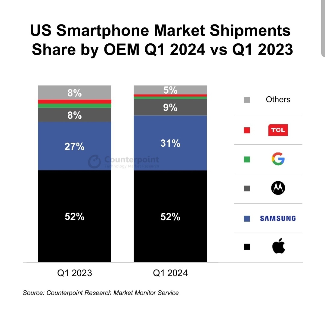 카운터포인트는 "삼성전자가 4년 만에 미국 시장에서 최고 점유율을 기록했다. 갤럭시 S24 시리즈의 초기 출하량을 늘린 것은 시장에도 긍정적"이라며 "아이폰의 AI 기능 탑재 등이 강력하게 추진되고 있는 만큼 하반기에는 연휴, 신제품 출시 등과 함께 시장 성장 동인이 나타날 것"이라고 밝혔다.
