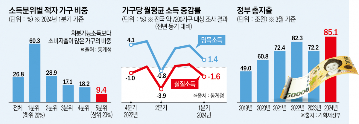 지출 정체에도 처분가능소득보다 소비지출이 큰 적자가구 비율은 26.8%로 2019년 1분기(31.5%) 이후 5년 만에 최대치로 찍었다.